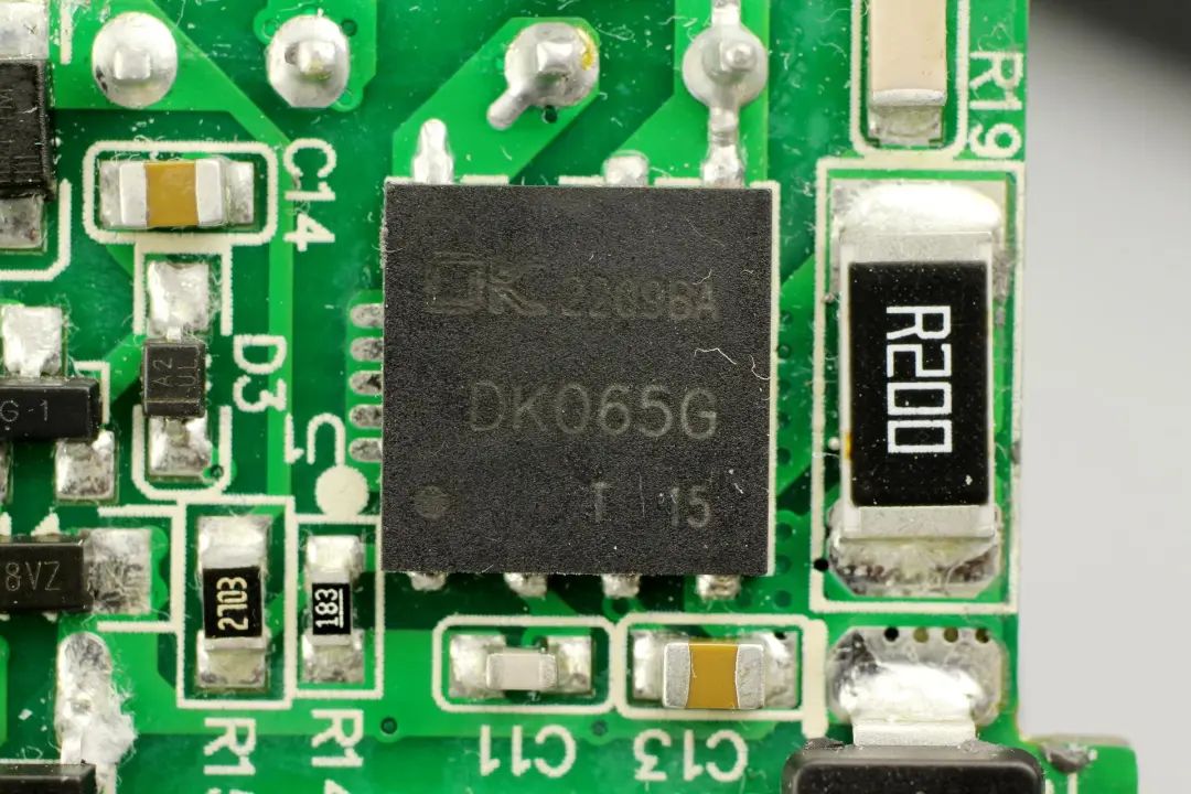 充電器初級(jí)主控芯片采用了一顆來(lái)自東科的合封氮化鎵芯片DK065G,是一顆內(nèi)部集成了650V氮化鎵開關(guān)管的準(zhǔn)諧振反激開關(guān)電源功率芯片。DK065G采用谷底開通以降低開關(guān)損耗,最高支持250kHz開關(guān)頻率,待機(jī)功耗低于50mW,采用DFN8*8封裝,適用于PD快充,電源適配器等應(yīng)用。