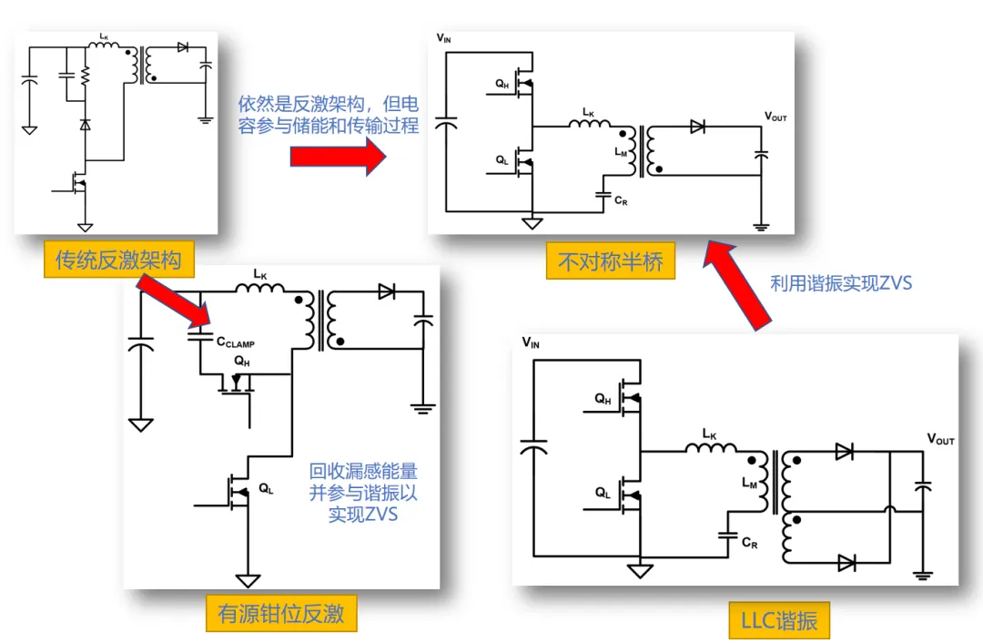 不對(duì)稱半橋AHB拓?fù)浼夹g(shù)集成了LLC和反激的優(yōu)點(diǎn),實(shí)現(xiàn)了初級(jí)側(cè)零電壓開關(guān)(ZVS)和次級(jí)側(cè)零電流開關(guān)(ZCS),提高了系統(tǒng)的效率。通過(guò)采用電感與電容雙儲(chǔ)能元件,可以有效減小變壓器體積,從而提高系統(tǒng)的整體緊湊性。